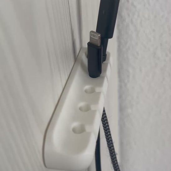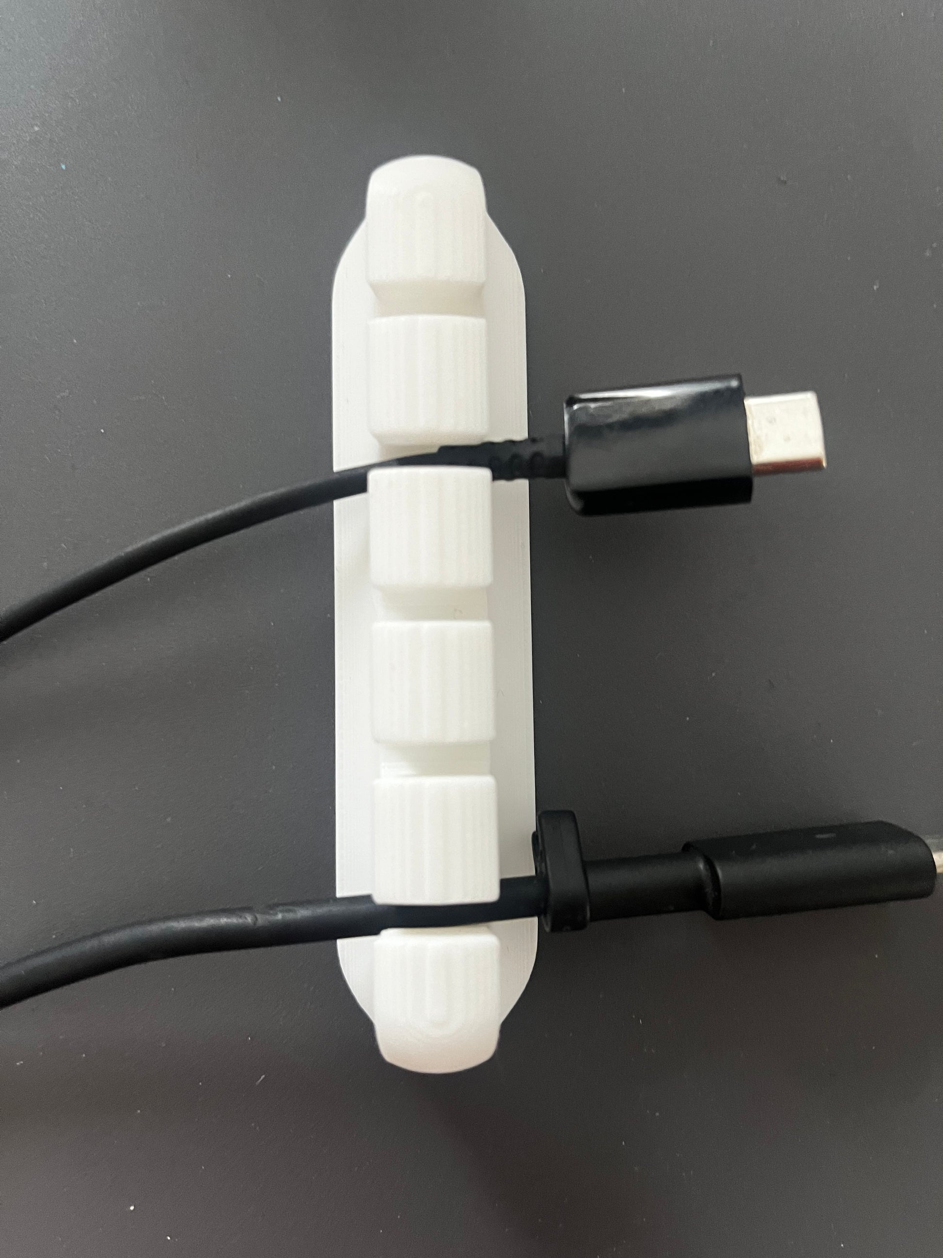 Der Halter wird präzise im 3D‑Druck gefertigt, hat sanft abgerundete Kanten und bietet fünf leichtgängige Schlitze für gängige Kabeldurchmesser.